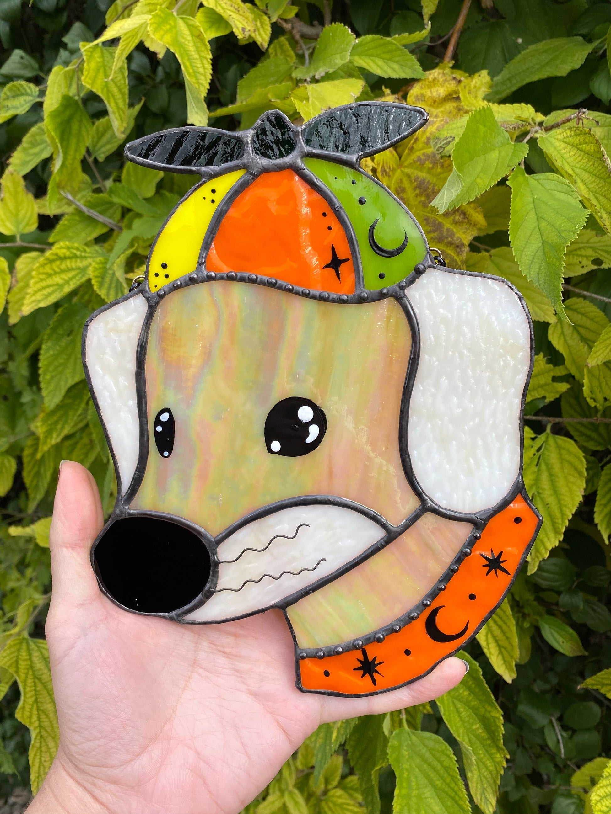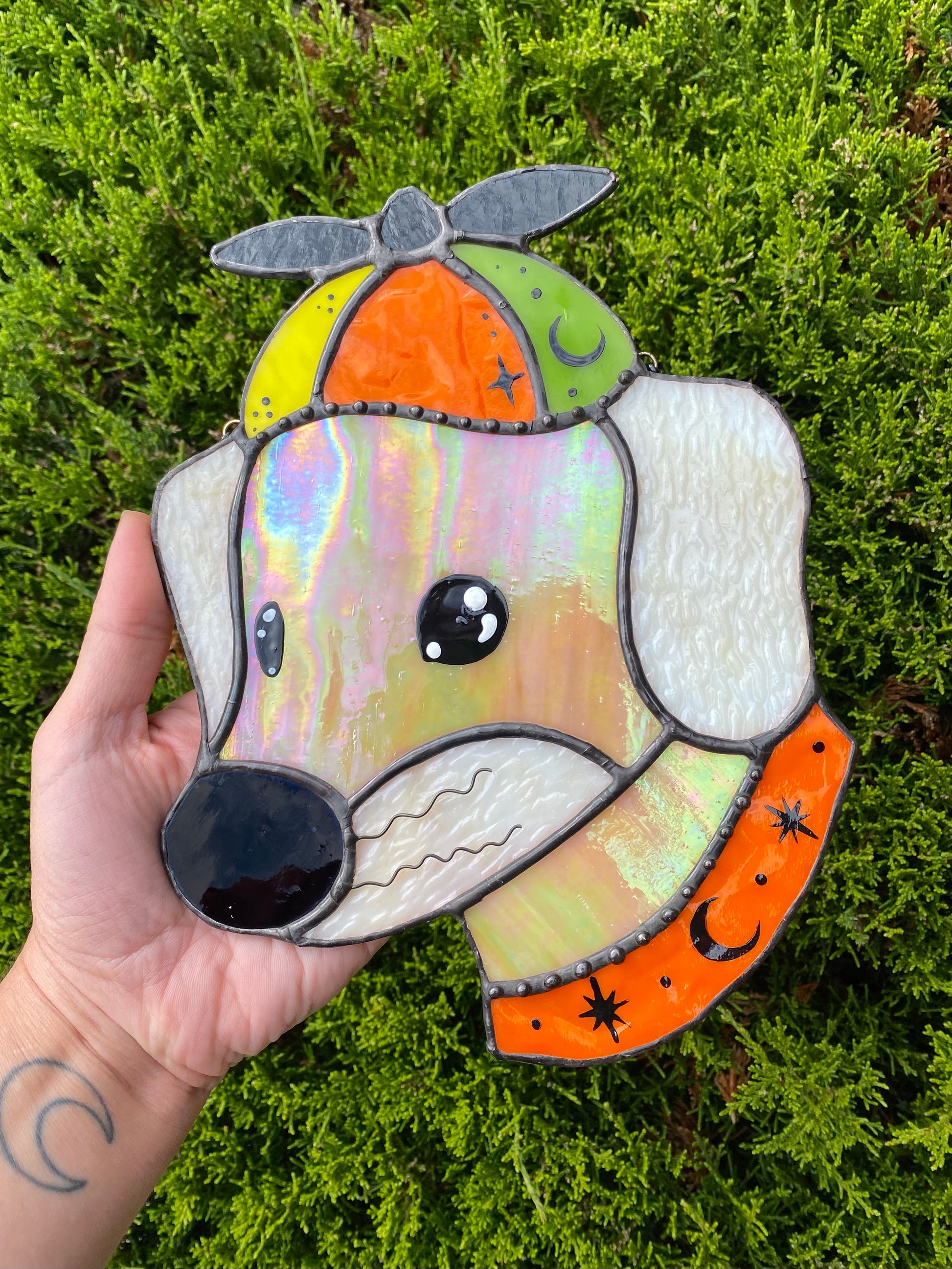 one of a kind! Made of iridescent and textured glass. Orange yuhiogony glass for the hat.