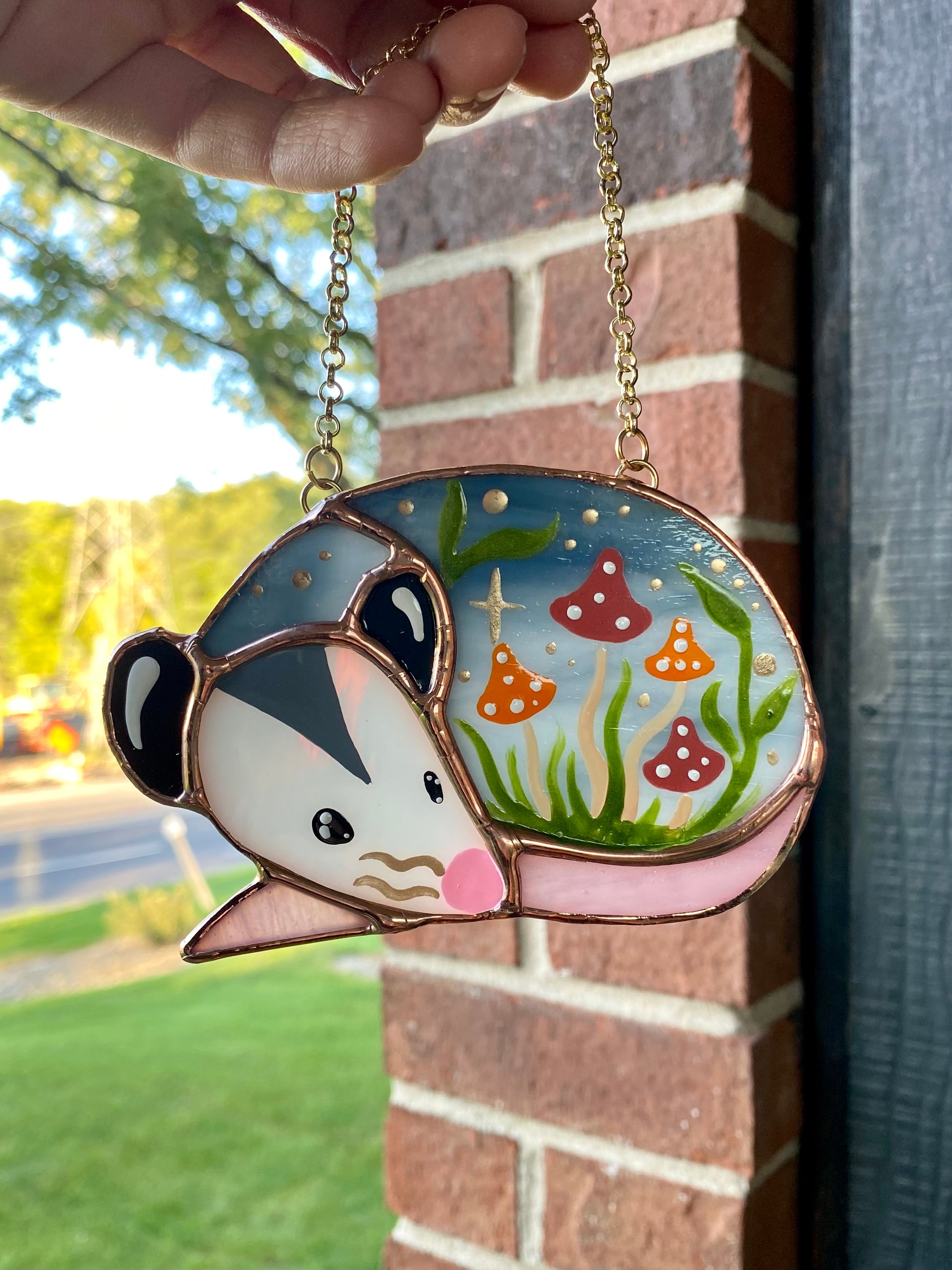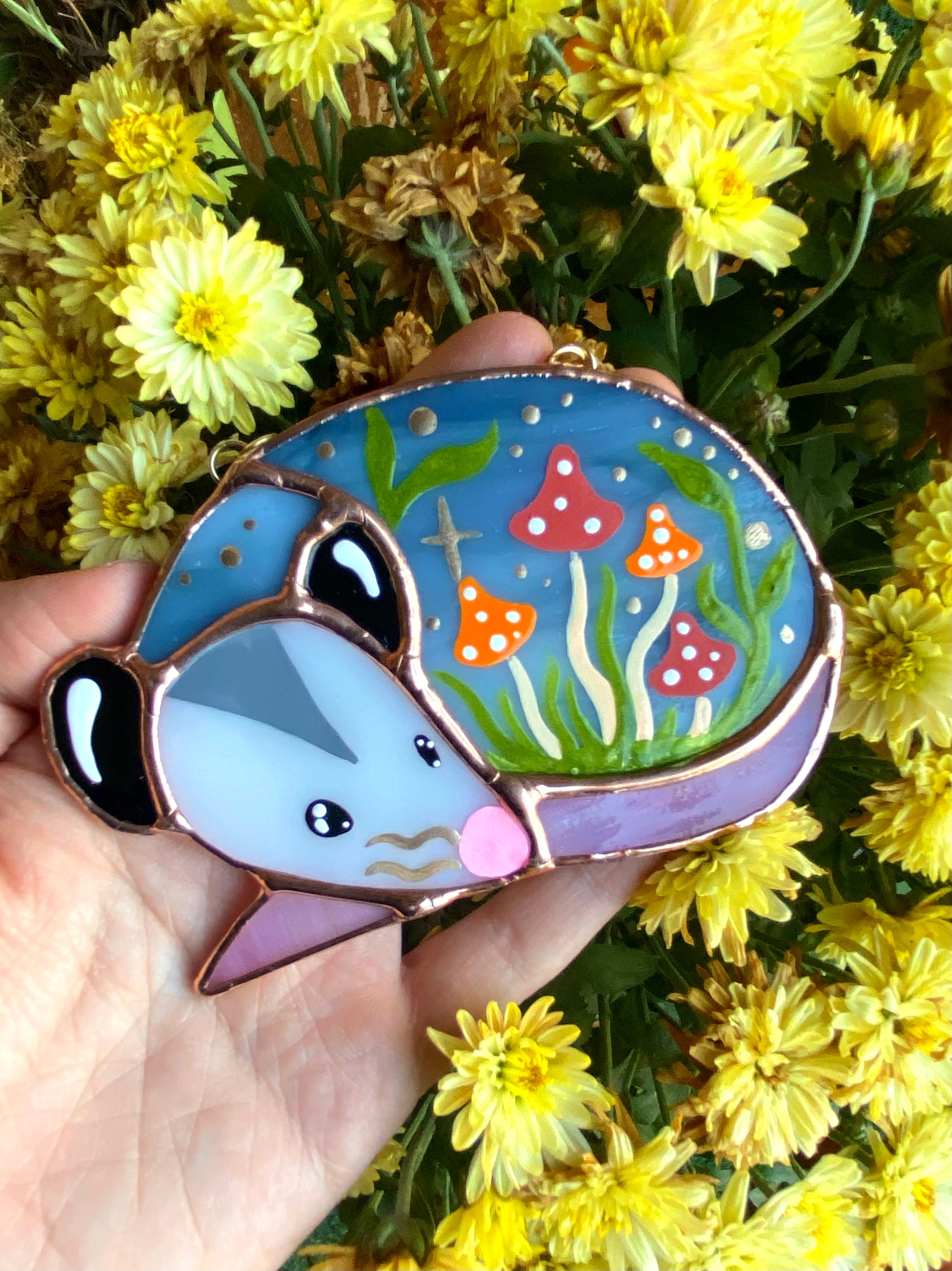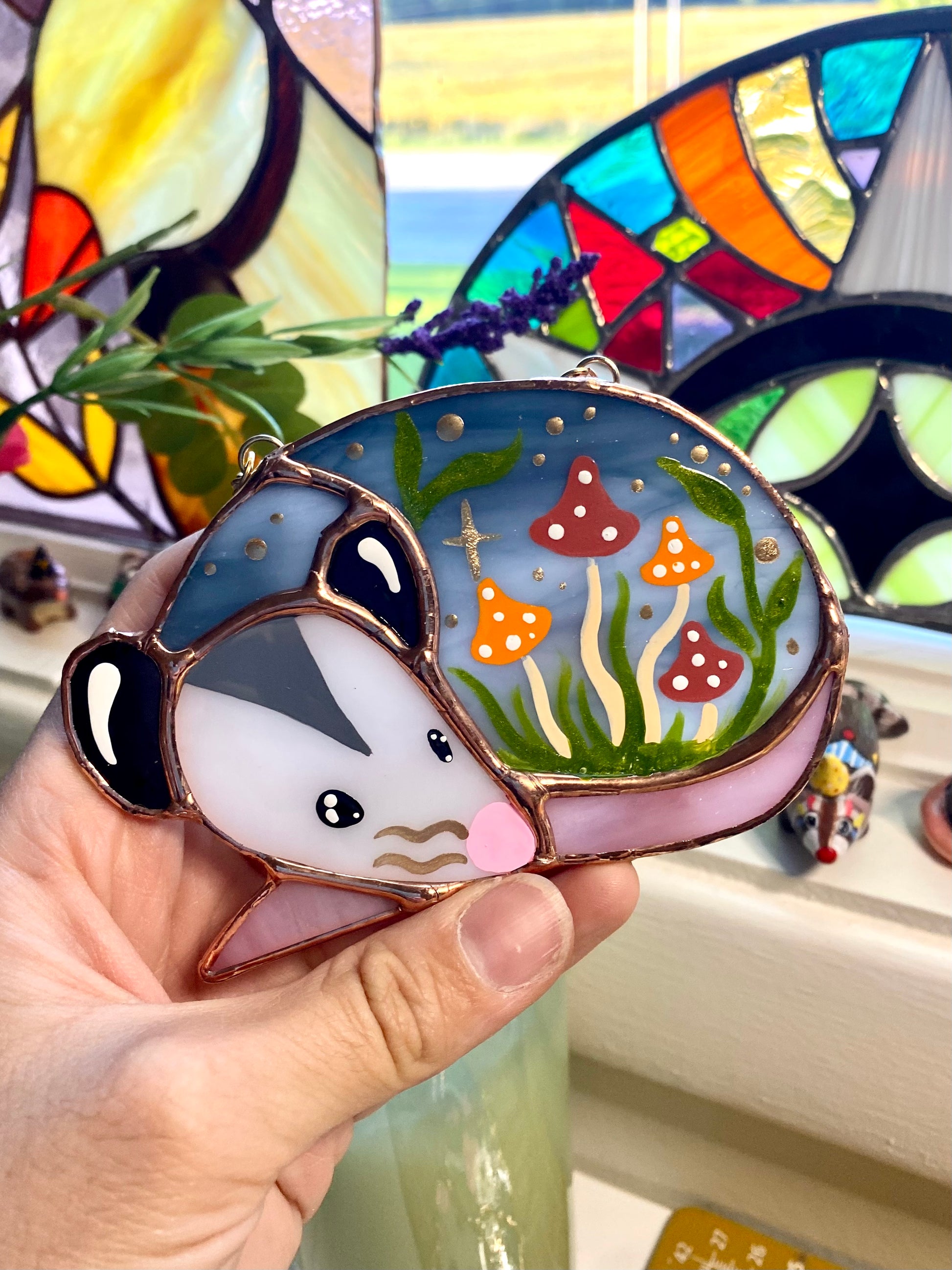 Sleepy Mushroom Bunch Opossum Mini Stained Glass Suncatcher