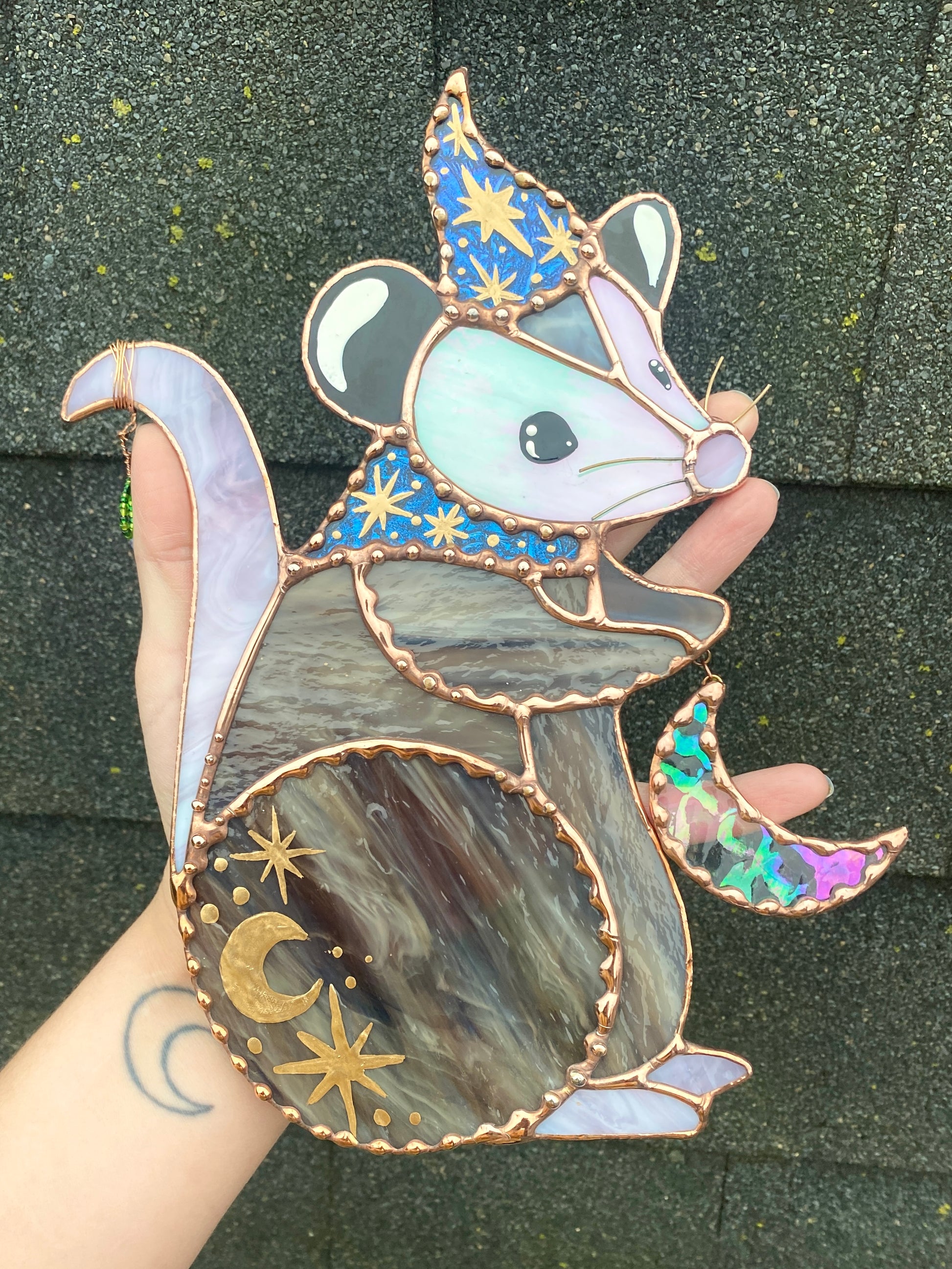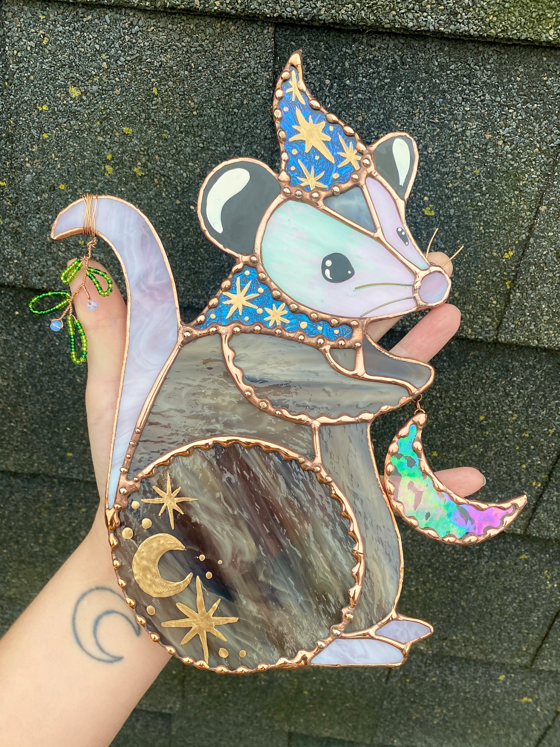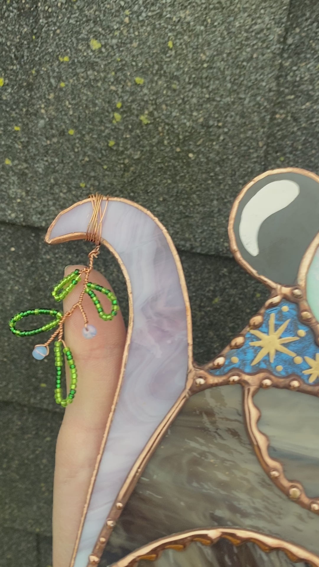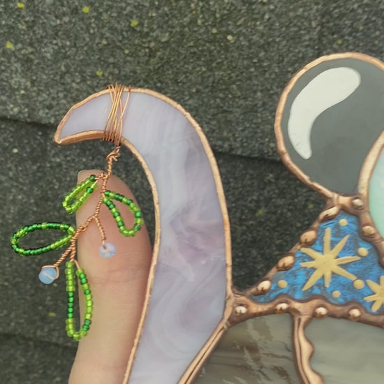 One of a kind. I used blue/violet shift glass for his hat and bandana, and a beautiful iridescent glass for the moon. Scalloped foil details and I made beaded wire foliage on his tail. Comes on a sturdy copper chain and screw-in hook for easy hanging.