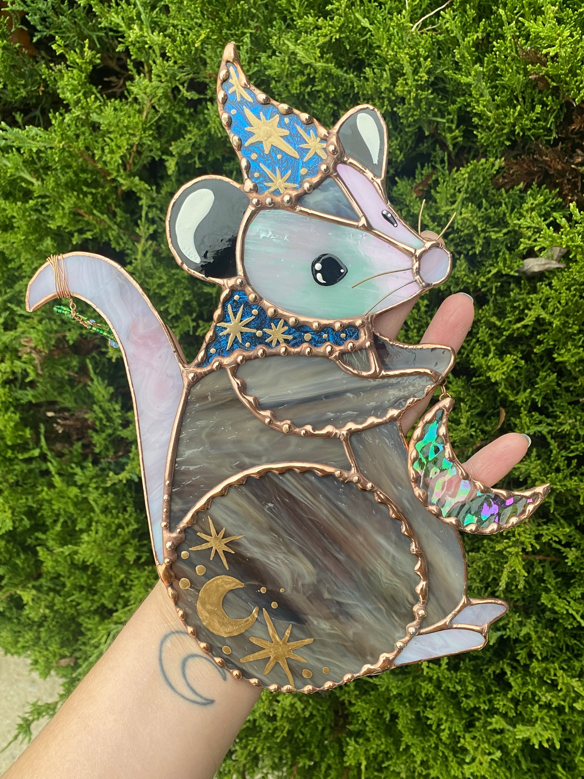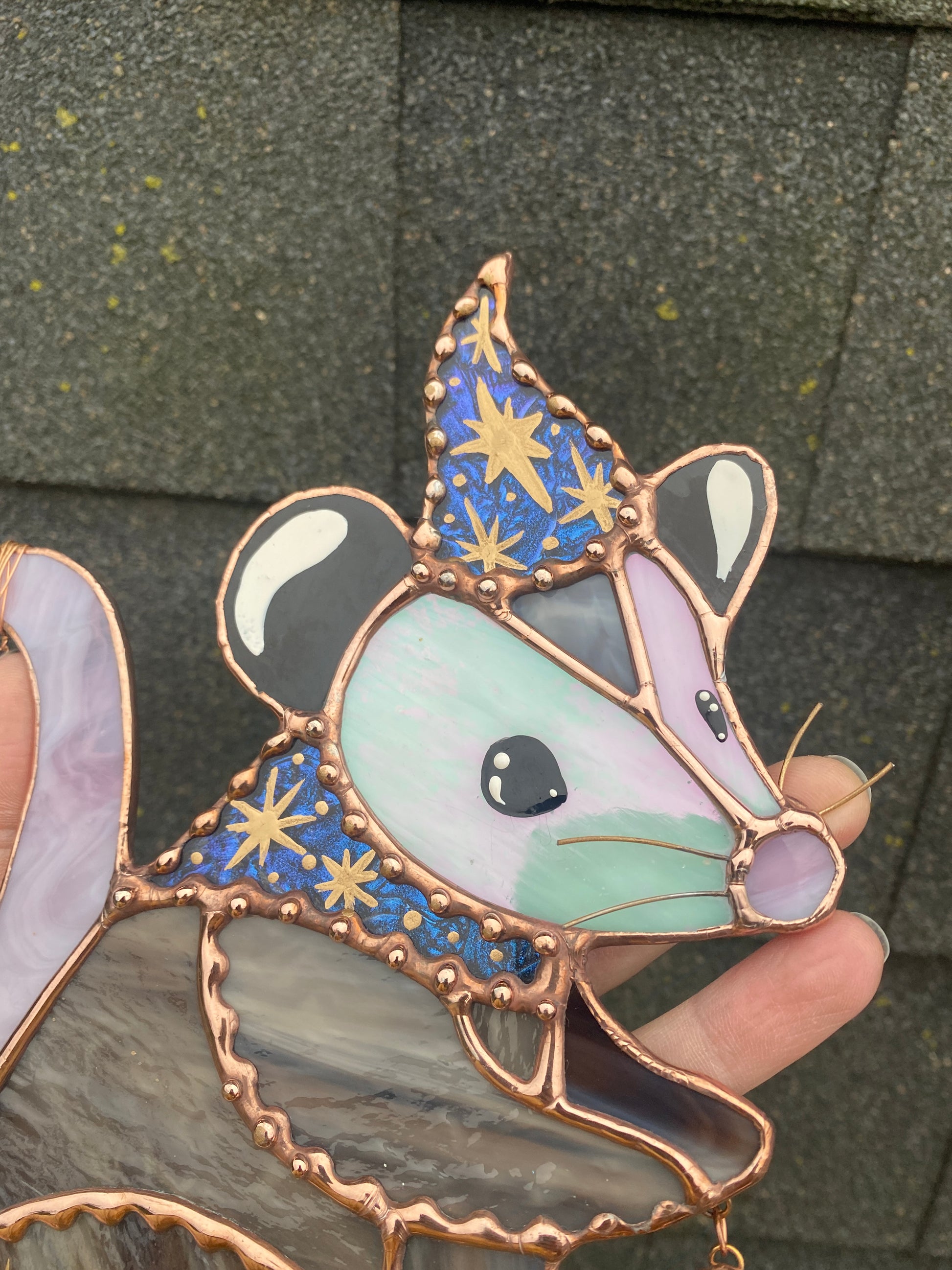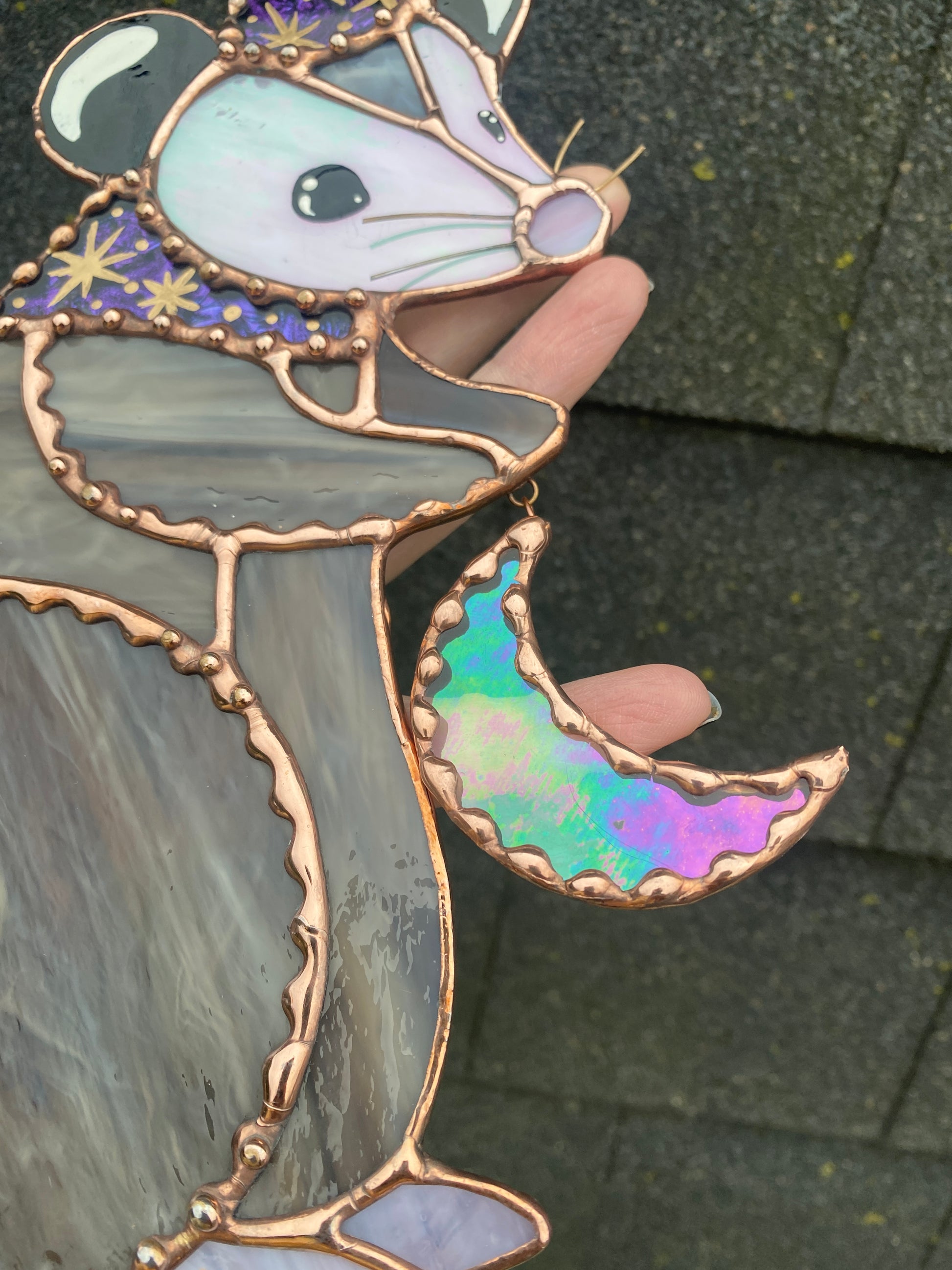 One of a kind. I used blue/violet shift glass for his hat and bandana, and a beautiful iridescent glass for the moon. Scalloped foil details and I made beaded wire foliage on his tail. Comes on a sturdy copper chain and screw-in hook for easy hanging.
