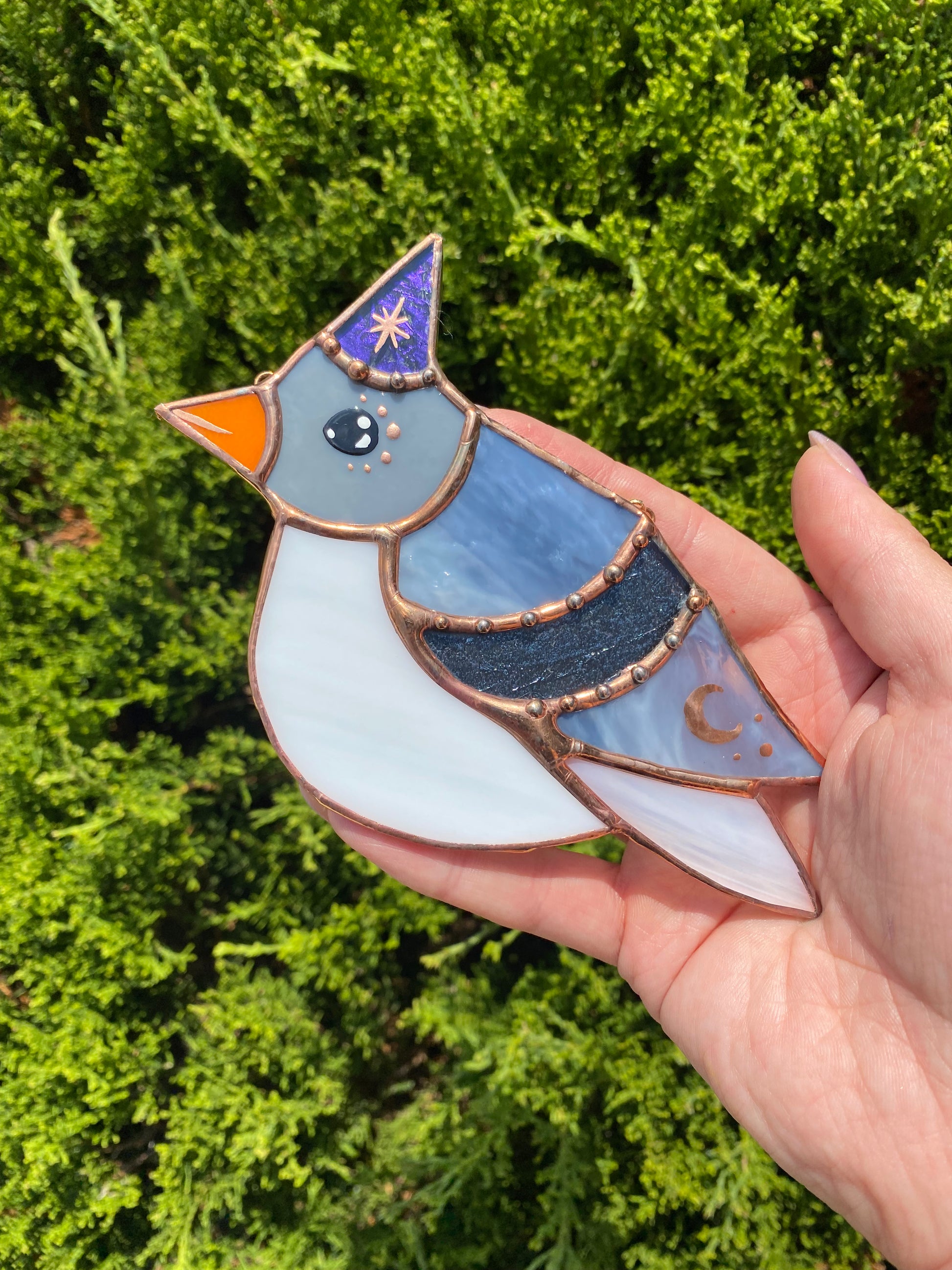 Pigeon is 5.5” by 4.5”. Hand painted with beaded details and suncatcher bead to reflect rainbows. Hat is made with blue/purple shift Van Gogh glass and black Van Gogh for the wing detail.