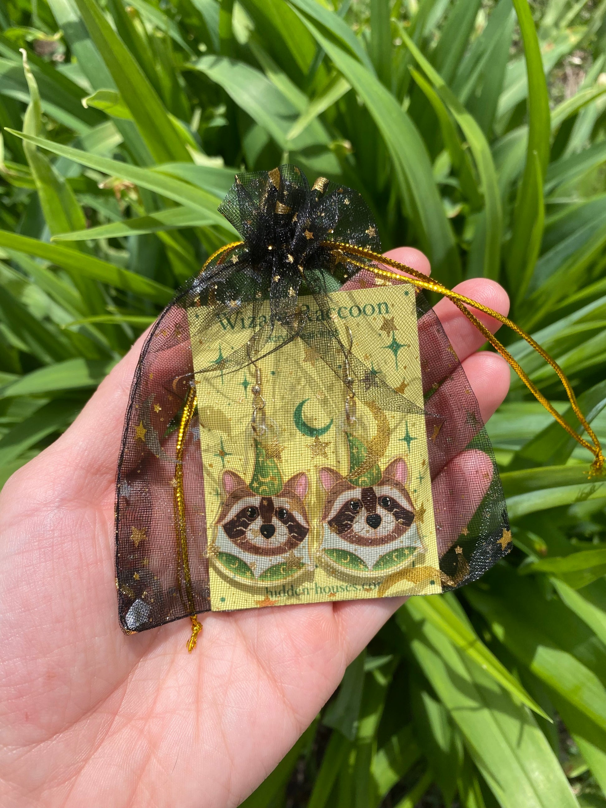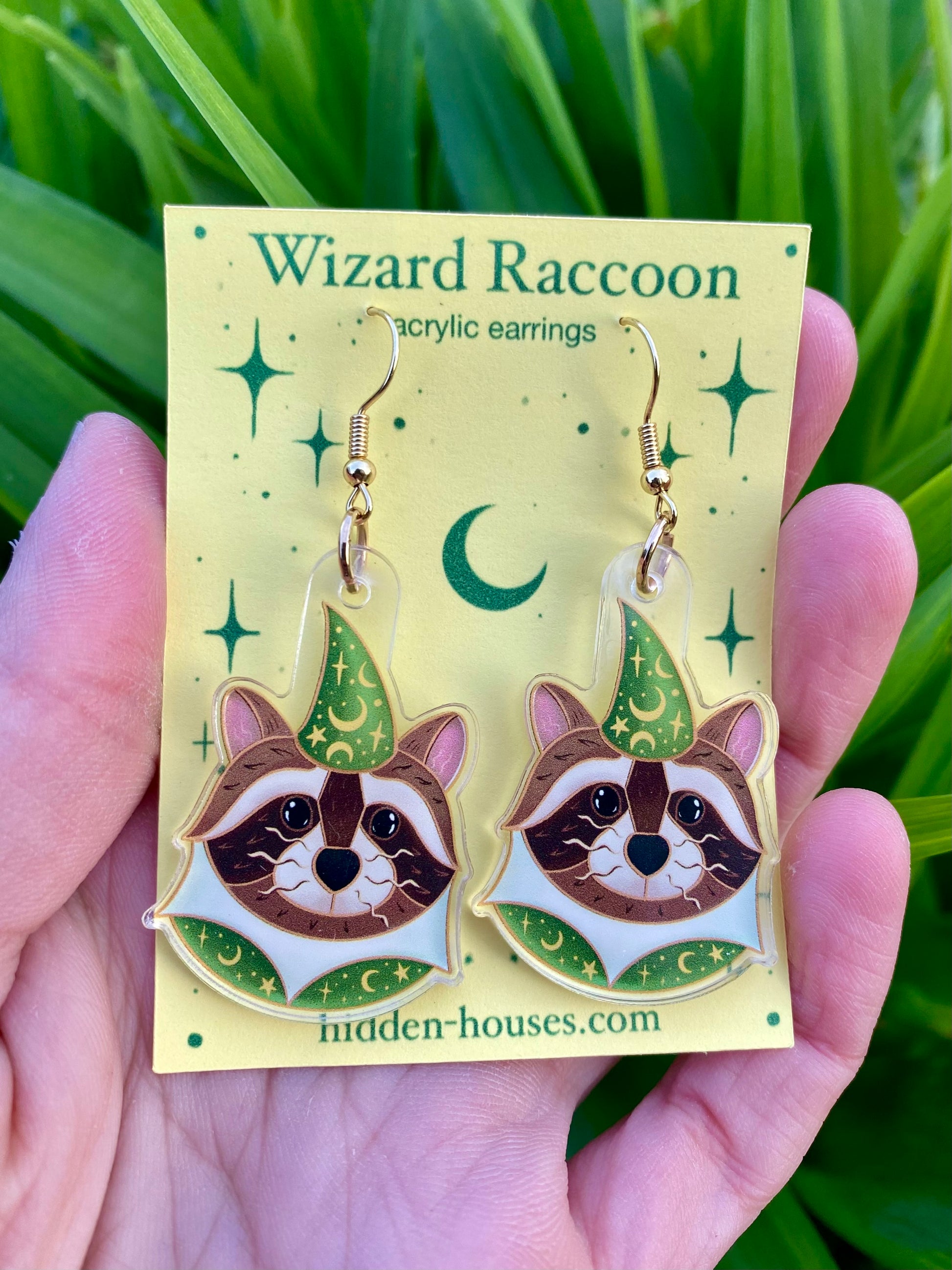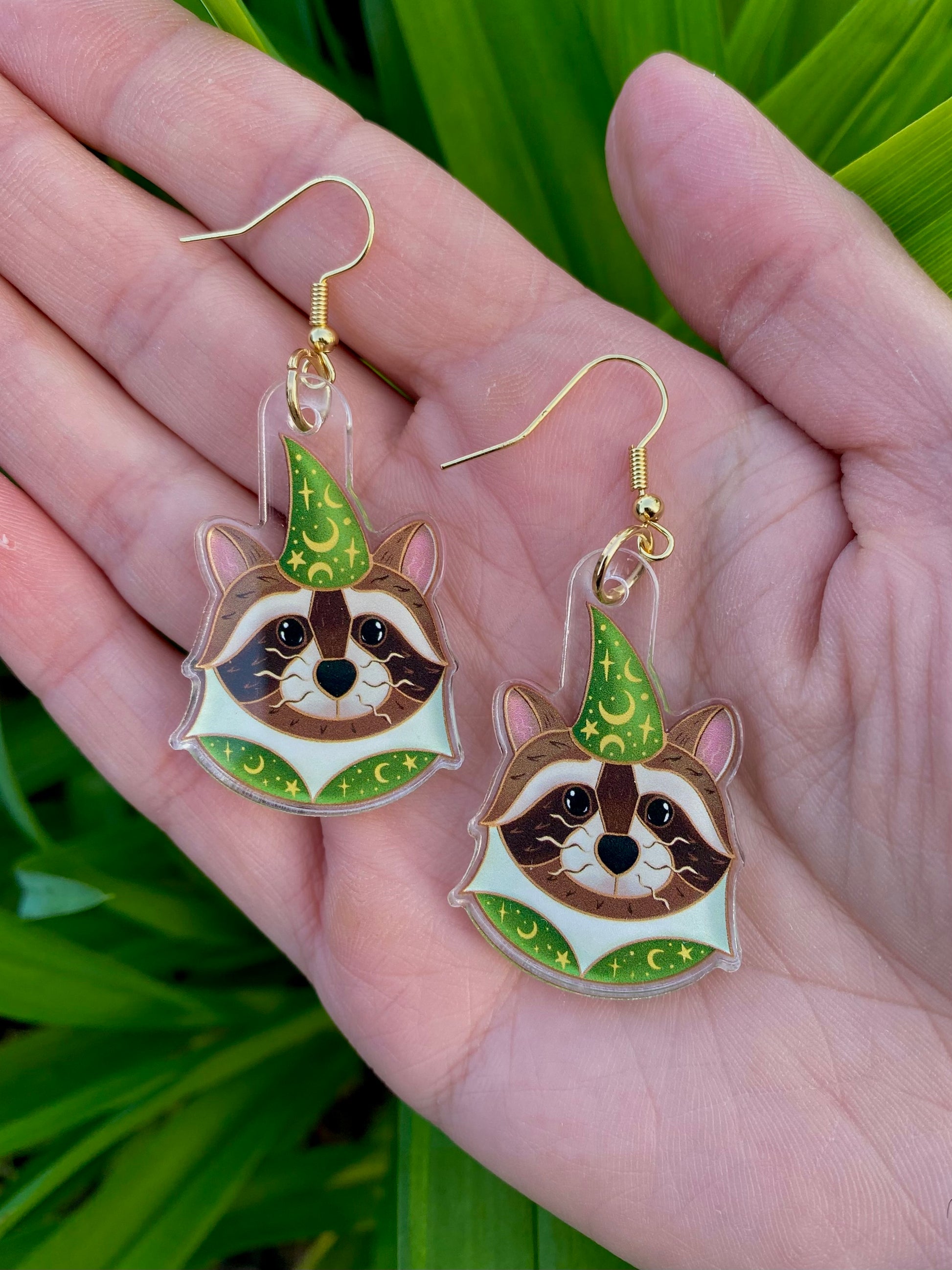Acrylic earrings. Raccoons measure 1.6” tall and 1.1” wide. Nickel free earrings.