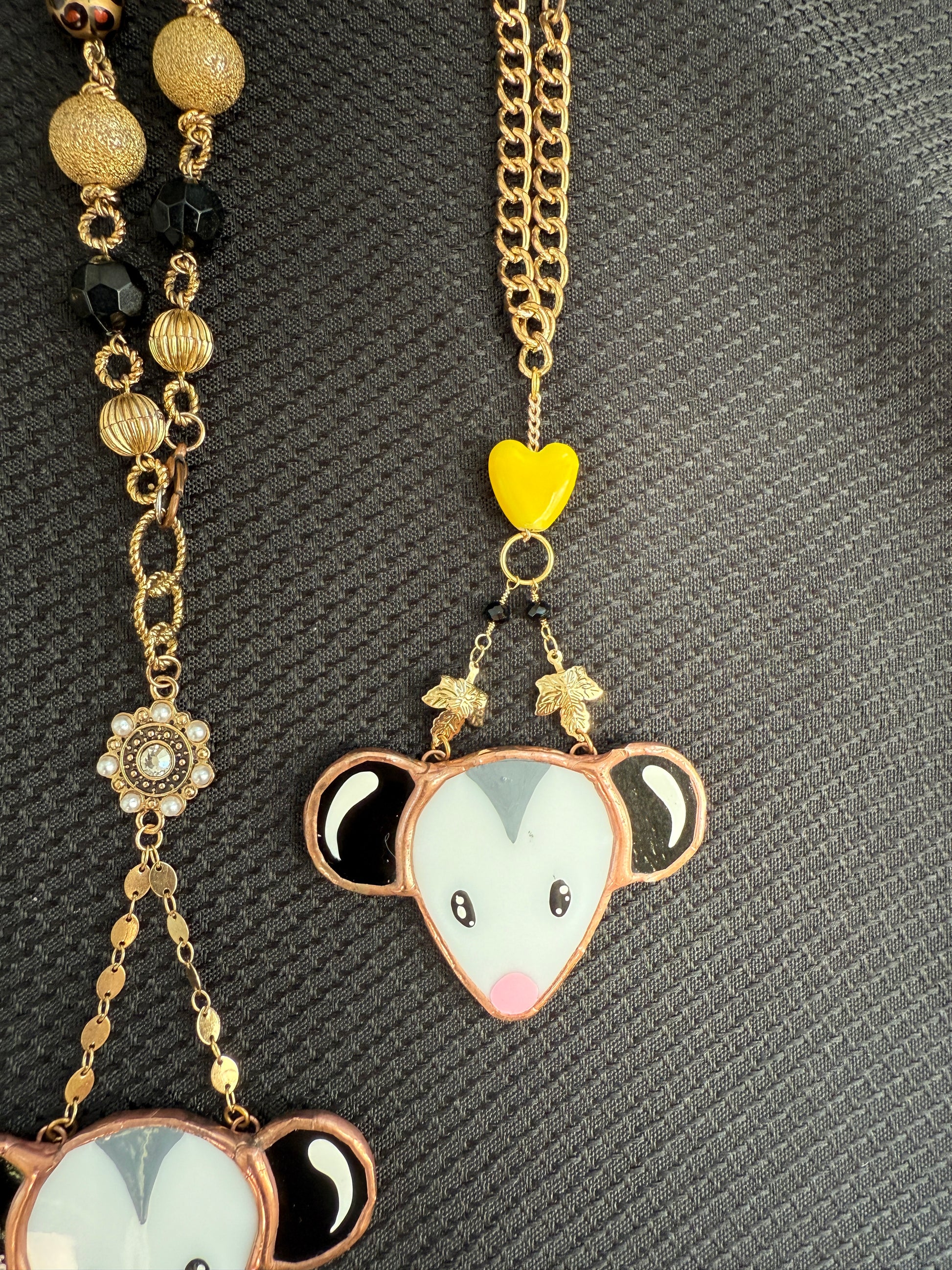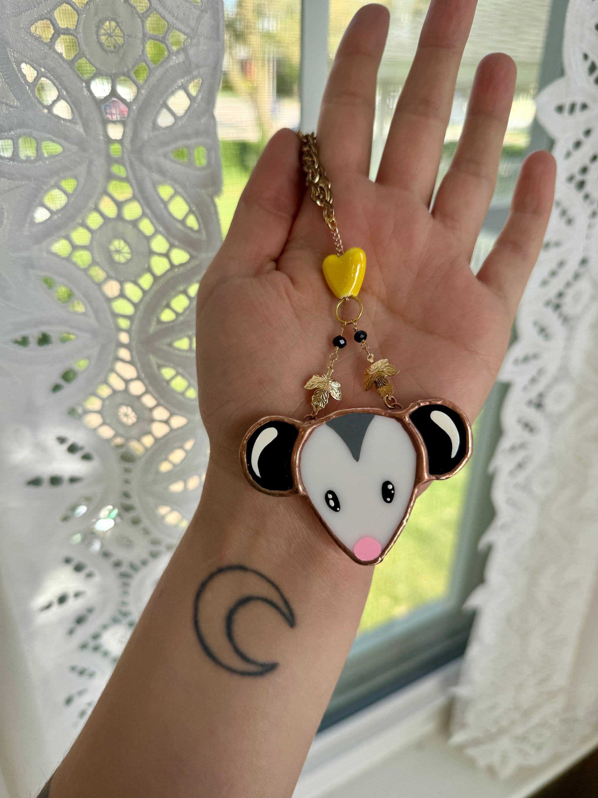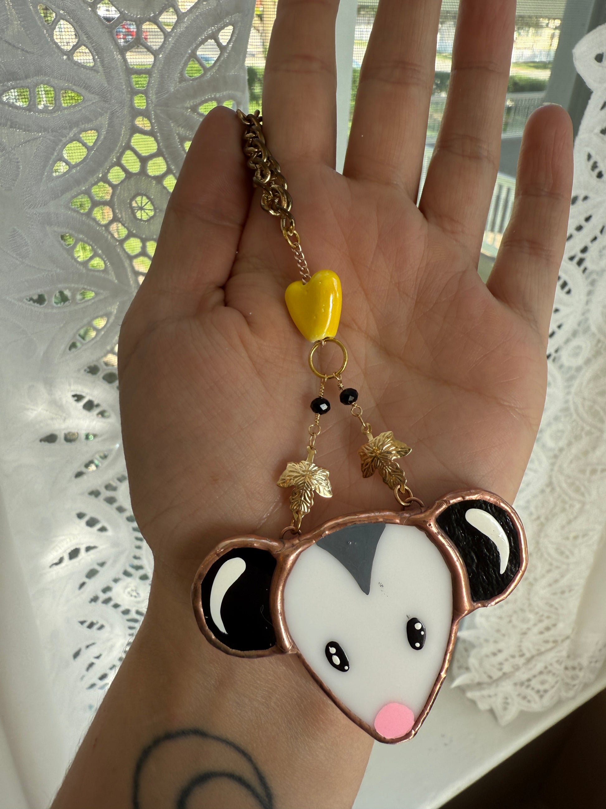 Opossum measures 2.5”. Has clasp for easy hanging around rear view mirror or other places- use at own risk and according to your state laws!